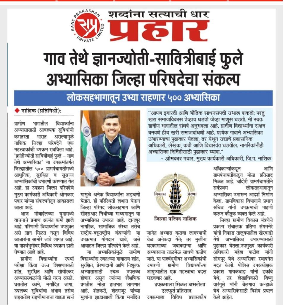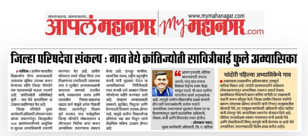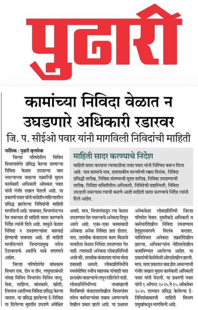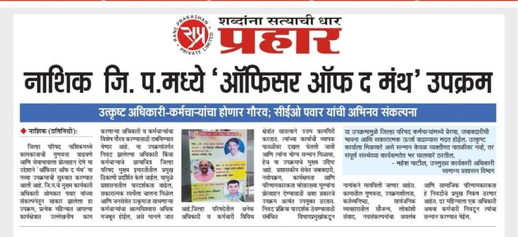 मा. मुख्य कार्यकारी अधिकारी, जिल्हा परिषद नाशिक यांच्या दूरदर्शी मार्गदर्शनाखाली व विशेष प्रयत्नांमुळे जिल्ह्यात विविध लोकहितकारी व विकासाभिमुख उपक्रम यशस्वीपणे राबविले जात आहेत. त्यापैकी काही महत्त्वपूर्ण उपक्रम पुढीलप्रमाणे-