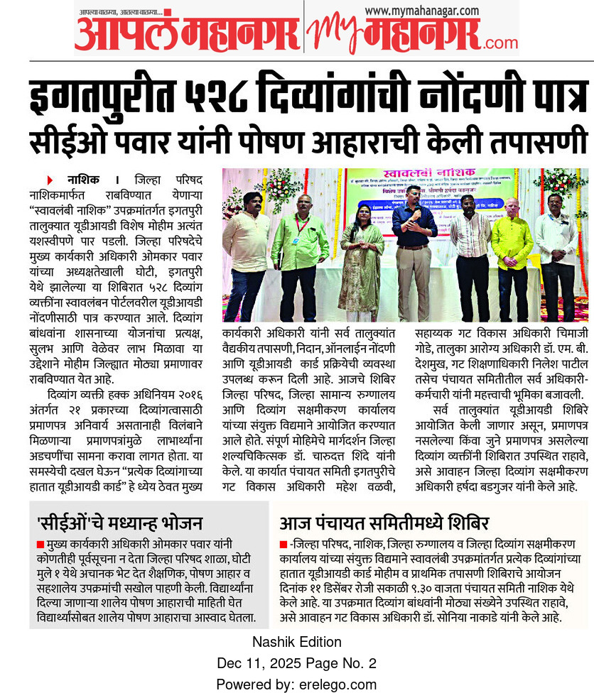 दिव्यांग व्यक्तींना समाजाच्या मुख्य प्रवाहात आणणे, त्यांचे सक्षमीकरण करणे आणि शासनाच्या सर्व योजनांचा प्रत्यक्ष लाभ वेळेत मिळवून देणे हे नाशिक जिल्हा परिषदेचे प्राधान्य असून, याच उद्देशाने “स्वावलंबी नाशिक” ही व्यापक मोहीम राबविण्यात येत आहे. दिव्यांग व्यक्ती हक्क अधिनियम २०१६ नुसार २१ प्रकारच्या दिव्यांग व्यक्तींना स्वावलंबन प्रणालीद्वारे दिव्यांगत्व वैद्यकीय प्रमाणपत्र मिळणे बंधनकारक आहे. परंतु वेळेत प्रमाणपत्र न मिळाल्याने अनेक दिव्यांगांना शासकीय योजनांच्या लाभापासून वंचित रहावे लागते. या समस्येची दखल घेऊन मुख्य कार्यकारी अधिकारी ओमकार पवार यांच्या संकल्पनेतून जिल्ह्यातील प्रत्येक दिव्यांग व्यक्तीला वेगाने, सुलभपणे व त्यांच्या तालुक्याच्या पातळीवरच दिव्यांगत्व प्रमाणपत्र उपलब्ध करून देण्याच्या हेतूने “प्रत्येक दिव्यांगाच्या हातात UDID कार्ड” ही विशेष मोहीम आकारास आली आहे.